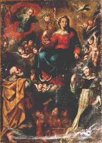 A san Matteo, sempre a Lercara Friddi, è posta una tela la quale non avendo un chiaro nome invalso ho denominato Il sacrificio di Cristo. Il santo raffigurato sulla destra a mezz’altezza, a mio avviso, non è san Matteo, benché il quadro sia all’altare principale: ipotizzo che quel posto lo abbia meritato piuttosto per la rappresentazione di anime purganti nella parte bassa. Ho attribuito pure questo a Giuseppe Salerno. La Chiesa del purgatorio (o di san Matteo) è posteriore sia a questo dipinto che alla Chiesa del rosario, essendo della seconda metà del ’600. San Matteo fu sede dell’arcipretura a Lercara prima della costruzione del Duomo, dopo che questa fu trasferita dalla Chiesa del rosario verosimilmente con la tela in oggetto. Dato che ne La Madonna con l’ostensorio c’è un santo spagnolo, san Domenico de Guzman, come Spagnolo era il barone de Amezcua, si può ipotizzare che il santo di cui si cerca un’identificazione abbia a che fare, per motivi campanilistici del de Amezcua, con la Spagna: quando l’opera fu dipinta, tra gli ultimissimi anni del Cinquecento ed i primissimi del Seicento, a Lercara non c’erano gli Scammacca (né tanto meno Matteo Scammacca, per il cui ricordo si dice che la Chiesa del purgatorio sia stata intitolata a san Matteo), quindi escluso l’evangelista penso a san Giacomo il Maggiore le cui reliquie si vogliono siano a Santiago de Compostela. Tra i suoi vari patronati ci sono i raccolti e la cavalleria dell’esercito spagnolo, e non va trascurato che è patrono di Spagna. Il sacrificio di Cristo fa il paio con La Santissima Trinità per quanto riguarda il tema. La simbologia trinitaria è presente anche ne La Madonna con l’ostensorio, ma qui al posto di Gesù c’è l’ostensorio (contenente l’ostia consacrata che è il corpo di Cristo). La Trinità e la Madonna compaiono in tutti questi tre dipinti con rilevanti somiglianze teologiche e stilistiche, quest’ultime più marcate nelle prime due tele: il volto di Maria ne Il Sacrificio di Cristo rievoca fortemente lo stile di quello ne La Santissima Trinità (cambia solamente l’angolazione), e quello di quest’ultimo ricalca l’analogo nel Giudizio universale. Anche lo stato di conservazione è lo stesso. Penso, per un principio di analogia, che Il Sacrificio di Cristo provenga pure dalla scomparsa chiesa della Madonna del rosario.
